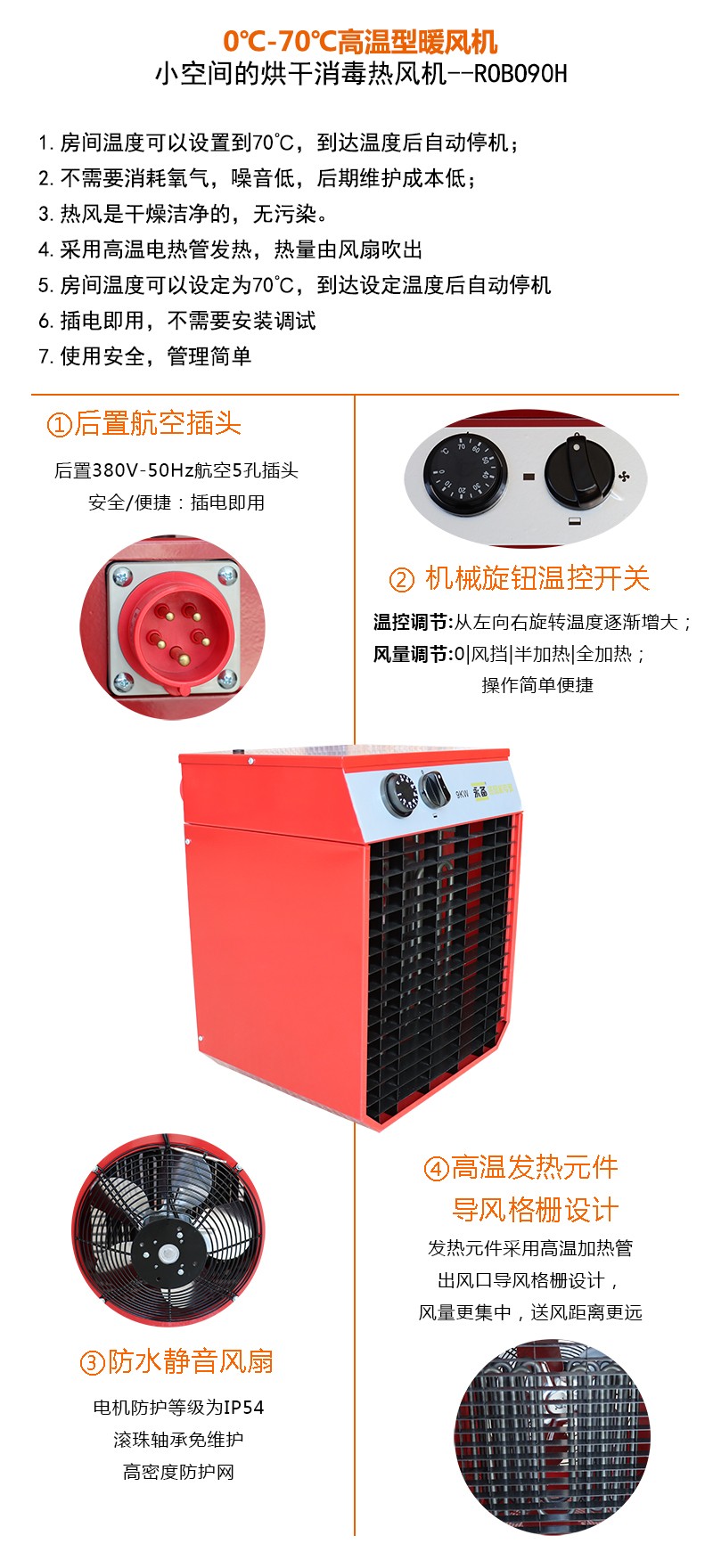 1.采用高温电热管发热,热量由风扇吹出